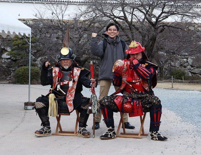 なんと、たまたま本物の武士がいたので写真を撮ってもらうことに成功。ご満悦のJET。
