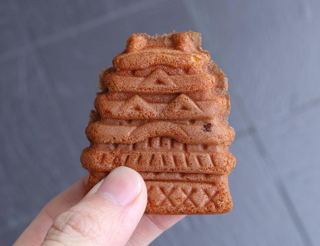 姫路城を模したお城やきを買う宮本牛乳。