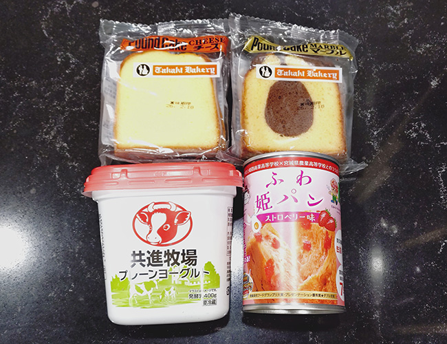 宮本牛乳がボンマルシェで買ったもの。乳製品とパンは地域性が表れがち。