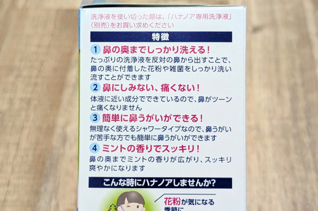 あとで調べてみると、このメーカーの鼻うがいには「鼻から入れて口から出すタイプ」もあるんだとか。