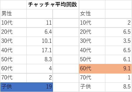 はい、6日間で588人を観測してきたわけですが、そのうち488人は1回もチャッチャしませんでした。