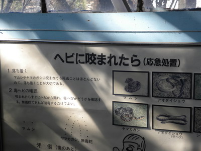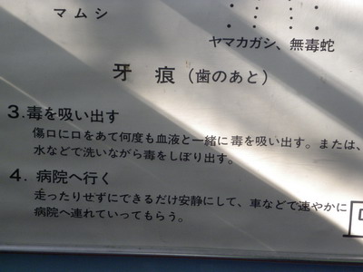 さすがヘビのことなら日本一詳しいヘビセンター。咬まれたときの対処もばっちり記載してあります。まずはその一。「落ち着く」。なんだそんなことかぁ、と思った貴方はもう死んでいます。そんなナメた態度の奴こそ、実際咬まれたら気が動転して自分の小便を患部にかけたりするのです。まずは冷静になって小便を止め、ちんこをそのままにファスナーを勢いよく引き上げて思いっきり挟んでから、深呼吸をして落ち着いてください。