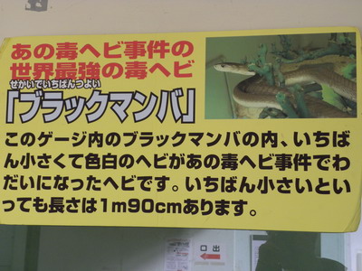 こいつはヤバいッ・・・!ヤバい臭いがプンプンするぜッ・・・!なぜなら他のヘビと違い、解説には「押収ヘビ」のシールが!見れば強力な神経毒をもっているようです。なんて奴ッ・・・!しかしさっきからケージの中を見てもソレらしいヘビが見当たりません。おかしいッ・・・!武道の達人は気配をも自在に操るというが、まさかこいつも気配を消しているのか・・・?