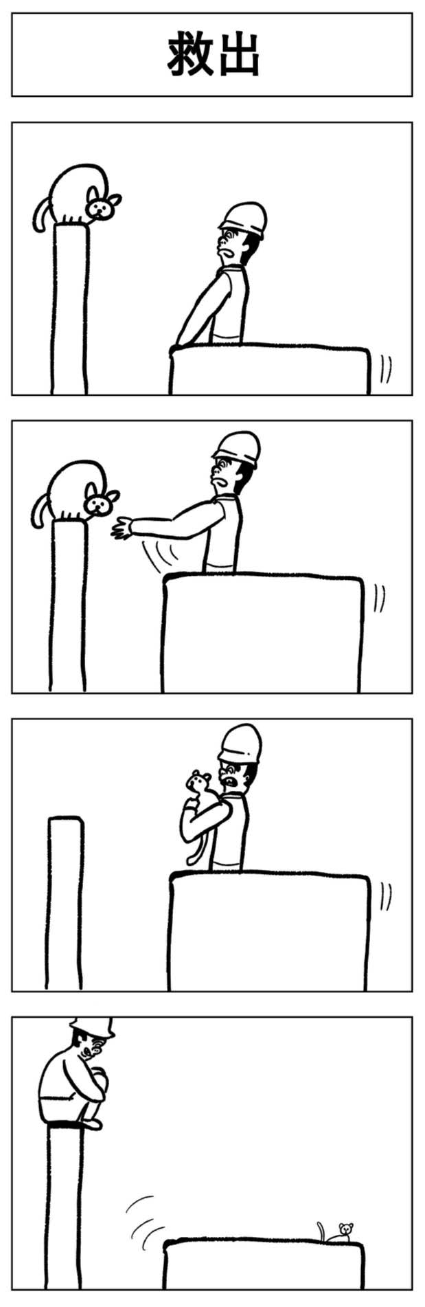 カートゥーンのキャラが自分が空中にいることに気づき、落下するまでの間に思うこと