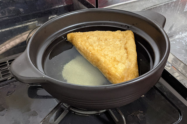 作るのも一瞬なんですよね。昆布だしを溶いた水に油揚げを浮かべて…