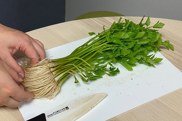 ささ、ご賞味あれい……。これでみんなせりにハマっちゃうかもなー。スーパーになかなか売ってないんだよねー、せり。