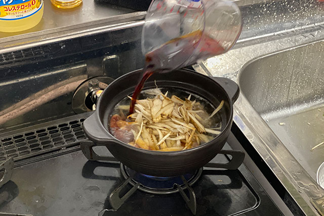 ごぼうを入れて、お酒100ml、醤油大さじ2、みりん大さじ1で味付け。