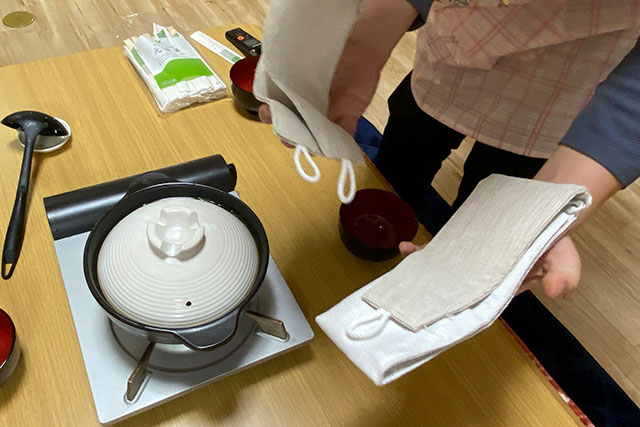 さっきまでは、タオルを鍋つかみ代わりにして運んでました。