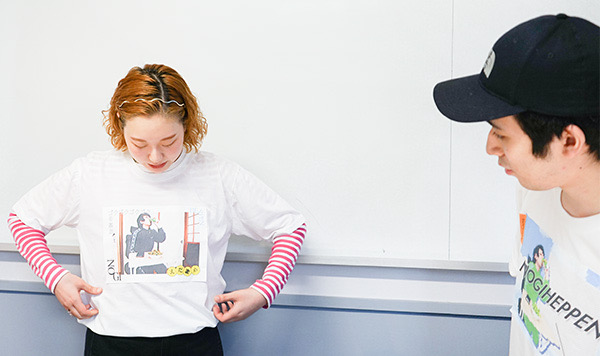 こちらの絵柄は” ニュアンス ”をイメージしていて、なんかあの〜ニュアンスゥ〜って感じです。今回は予算の都合で白Tにコピー用紙を直接貼り付けたプロトタイプになってます。