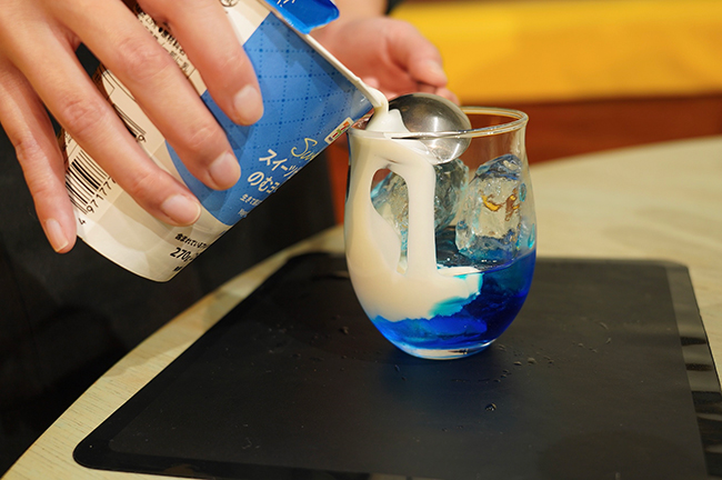 飲むヨーグルトを注ぎます(買うべき商品を誤り、うまいこと2層にできなかった)。