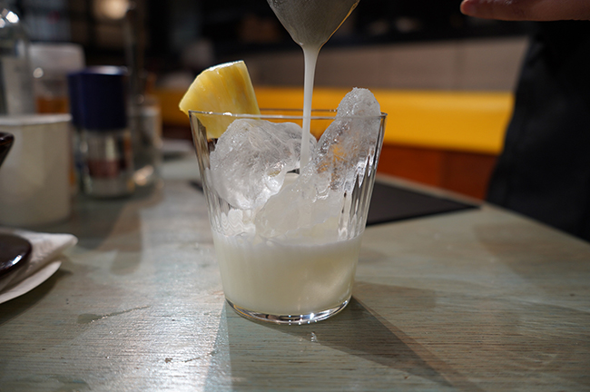 ストレーナーで濾して泡をなめらかにし、炭酸水で割ったらスライスパイナップル、エディブルフラワーを飾って完成。