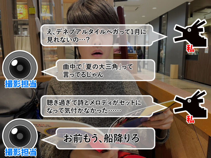カタチがシンプルだから見つけやすい気がした。歌詞でも2番で星見つけるのに難航してたし、いい体験ができましたね。