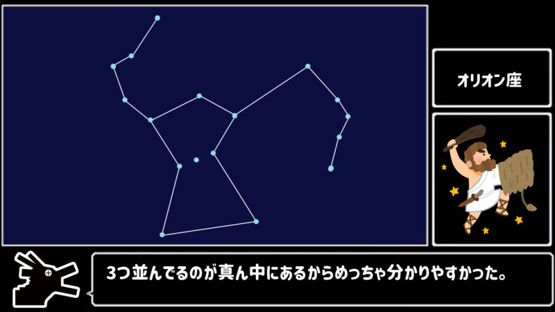 オリオン座は分かりやすさの代名詞と言うか、3つ繋がった星を中心に探せばいいからメチャ見つけやすかった。みんなもオリオン座だけ見つけて友人にイキろう!!