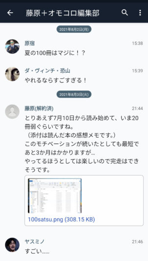 2021年7月9日 連絡用チャットツール上におきましてオモコロ編集部(以下「編集部」)に対し当特集を執筆しているオモコロライター・藤原(以下「ライター」)が「『新潮文庫の100冊 夏のうちに全部読めるのか』という企画をやりたい」ともちかけました(図1)。