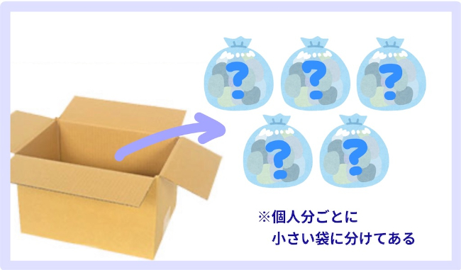 ダンボールの中は個人分ごとに袋5つに分けて入ってるので、気になる袋からひとつずつ開けていってもらえれば!