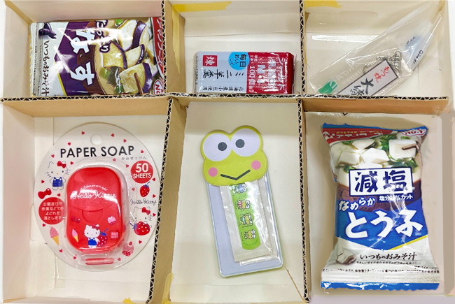 あっ私が入れました! こちらは海外で生き抜くための「食」「衛生」「ときめき」のアイテムを詰め込んでおります