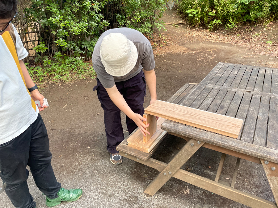 待ってる間に、L字の金具で踏み台の脚をさらに補強。
