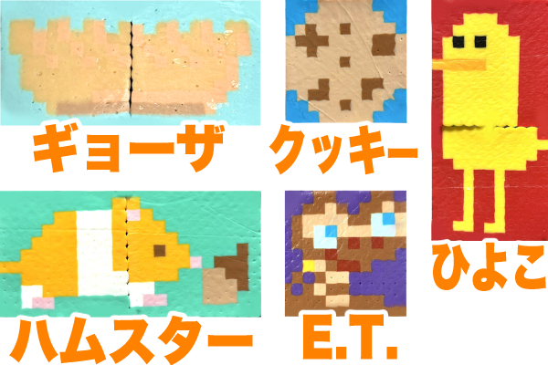 土鍋にしか見えない餃子や、じゃがいもにしか見えないチョコチップクッキー、やたら長いヒヨコなど、ビーズを並べて絵を描くのは意外と難しく普段絵を描く時より、モチーフの形を見極め、輪郭をとるのに苦労しました!でも!そこがだんだん楽しくなってきます!!!