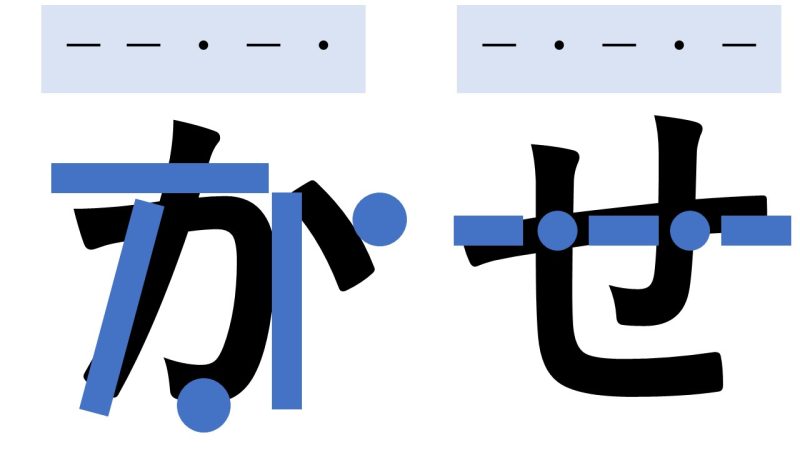「か」はスッスッチョンスッ、最後チョンで「--・-・」、というように書き方の流れで決めることもあれば、「せ」は画と画の交差するポイントが一直線に並んでいる感じが「-・-・-」っぽいよね、というように形の全体観で決めることもあります。