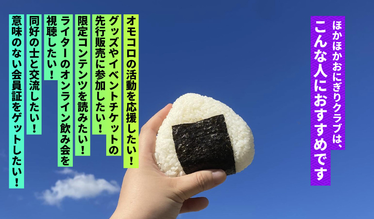 さて、そろそろ開設から6年が経過している有料会員コミュニティ「ほかほかおにぎりクラブ」では、会員限定の会報誌や会員証などの特別グッズをはじめ、イベント現地観覧チケットや新グッズの先行販売、オモコロチャンネルの未公開動画やバーグハンバーグバーグ社内チャットなど会員だけが楽しめるコンテンツが超目白押し!!