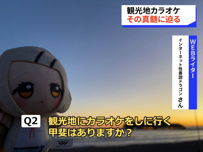 Q1で言った通り、どう考えても逆張りとしか思えない『観光地にカラオケをしにいく事』は嘘偽りなく楽しかったし、人生において重要な経験になったと胸を張って言えるケド、やはりカラオケの為だけに観光地に向かう事は多角的かつ総合的に考えると────────────