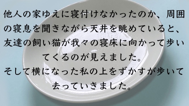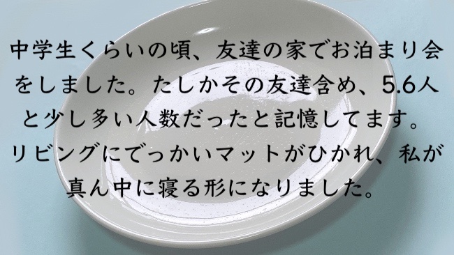 良い記憶。お泊まり会唯一の記憶がこれだと思うと、たしかにべつに忘れてもいい気もするけど、これだけでも覚えておきたい気もする。そういえば子供の頃友達とお泊まり会とかやってるはずなのに全然覚えてないな。