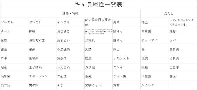 この乙女ゲーム作成シートは、キャラクターの性格や特徴などを記入できるように作ってみました。