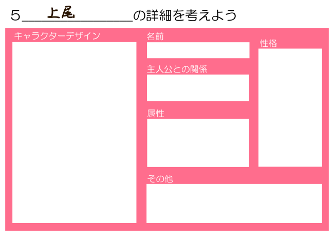 前回軽く決めたシナリオの展開もとに、枠組みのシートを作ってきたよ。これを埋めていこう!