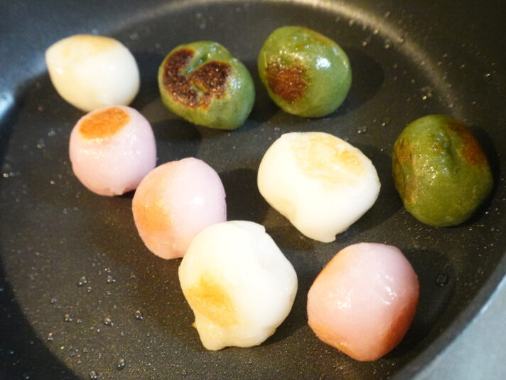 つまみ食いをしたら焼いただけの三色団子が本気で美味しいです。焦げがあるのと無いので完全に別物。これはみんな知っていたライフハックですか?!教えてよ!!!
