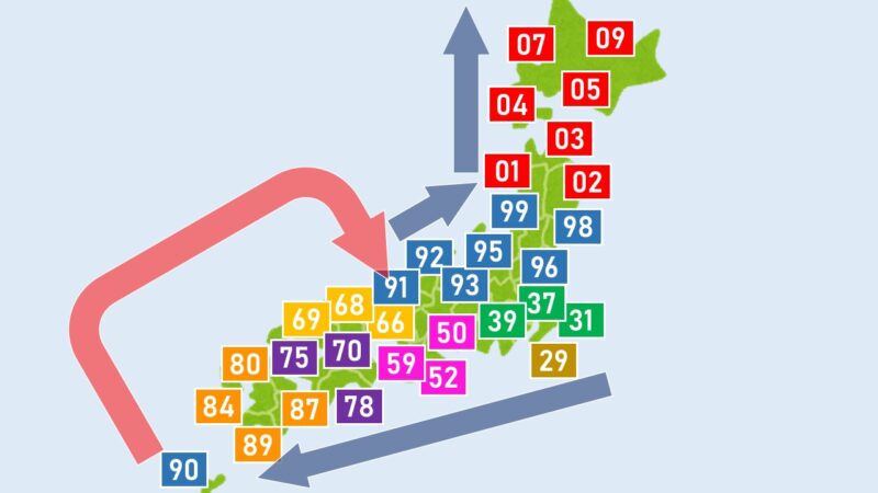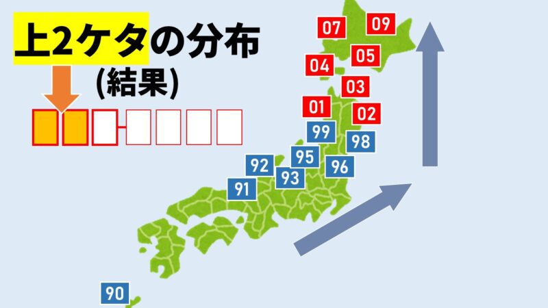 たとえば秋田県は「01」、次の岩手県は「02」など、各県に1つずつ割り振られることもあれば、北海道のように「04」~「09」をごっそり受け持つこともあるっぽい。