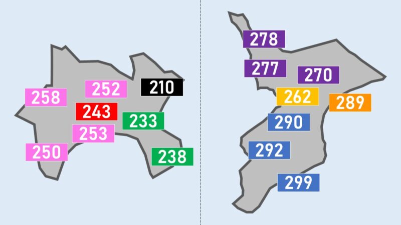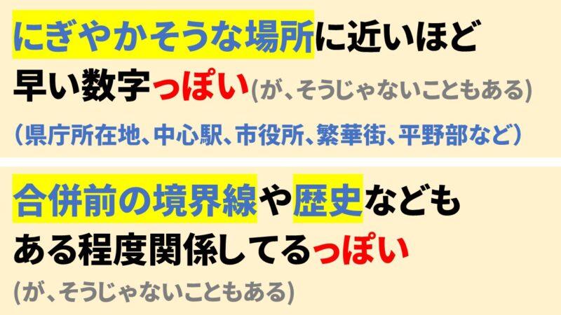 なんとなく「大きな街ほど早い数字っぽい」雰囲気はあるのですが、どうもそれだけではなさそう。