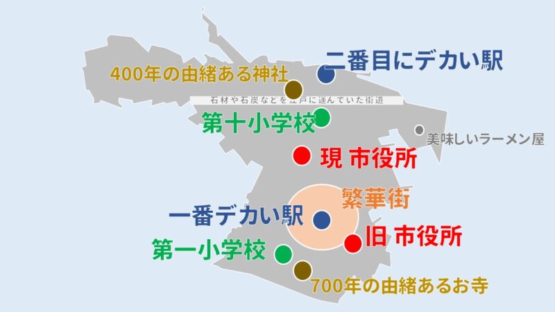 ・Googleマップを眺めてわかる範囲の「にぎやか」情報(市役所、駅など)