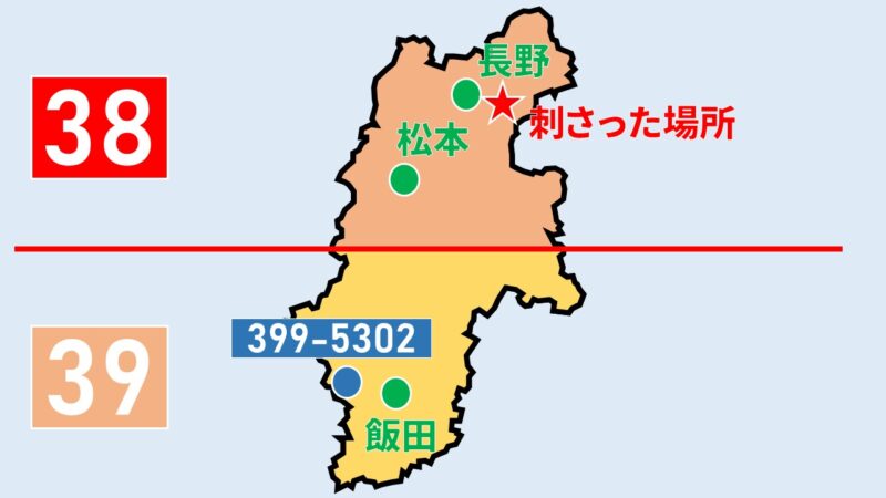 群馬県(「37」)からの流れを汲みやすい北側を「38」、南側を「39」と考えると、今回刺さった場所は「38」となります。