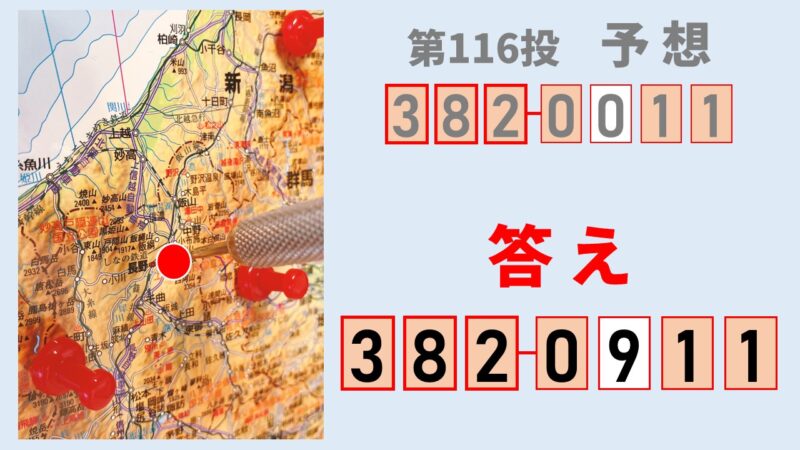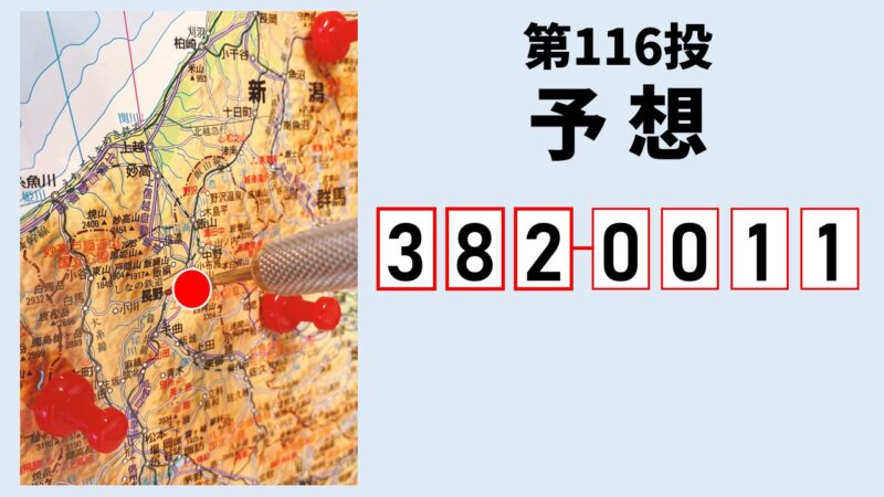 今回刺さった場所は県の北端に近いエリアなので、これ以上後回しにされて他の方角に郵便番号が流れていく可能性は低いと考え、381の直後である「382」と推測しました。
