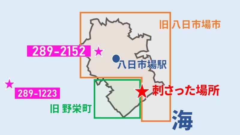 前回刺さった「289-2152」は、近くに八日市場駅があり、そっちがより旧市の中心地に近いと考え、今回は2152よりも少し大きめの数字を選択。