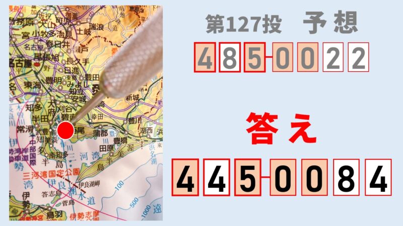 さらに愛知県内を大きい市中心でエリア分けしようとすると、名古屋・豊田・岡崎・豊橋が目につく。刺さった場所はどれかといえば岡崎に近いので、名古屋で45~46、豊田47、岡崎48と割り振る。といっても岡崎とはそこそこ離れているので「485」くらいかな。