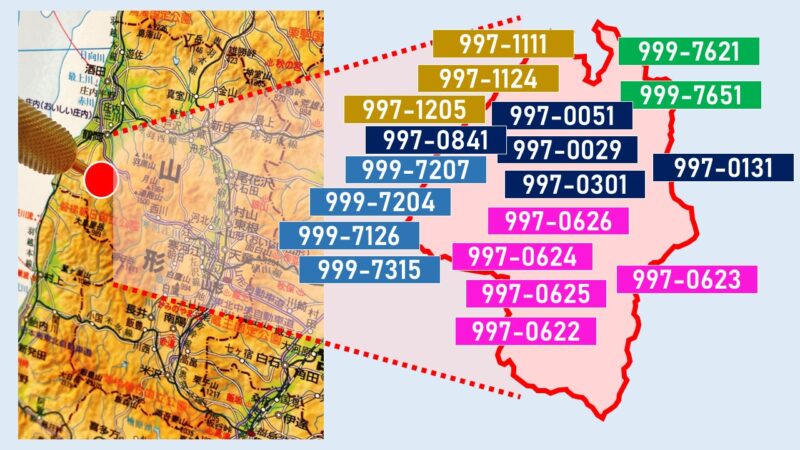 規模の大きいエリアで特に平地だと下4ケタ00スタートがち理論により、4-5ケタ目は「00」となります。