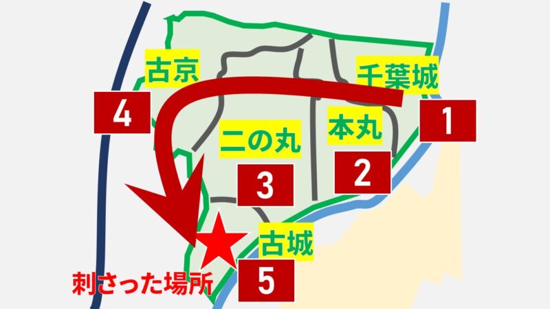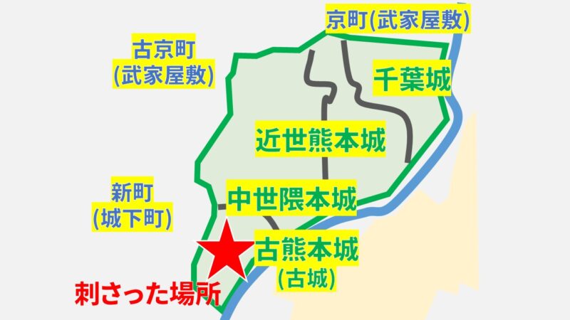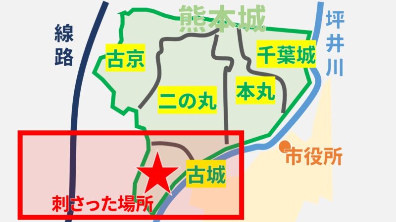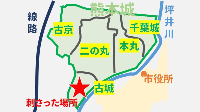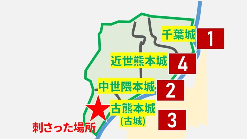 Google Map上で「熊本城」と表示されている場所以外も、「二の丸」「千葉城」など、明らかに城由来の地名が散見されます。そして刺さった場所も「古城」。