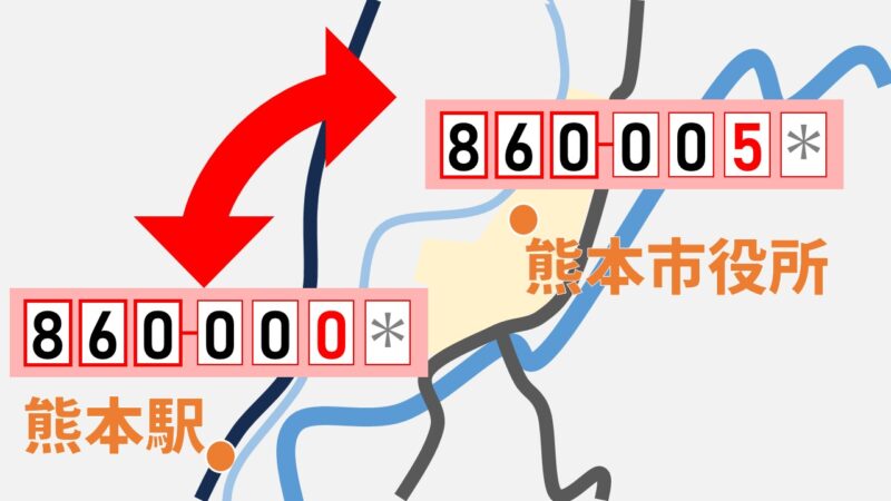 距離の大きさからして(研ぎ澄まされた勘)、6ケタ目が「0」になりうるのは駅エリア・役所エリアのどちらか一方のみでしょう。