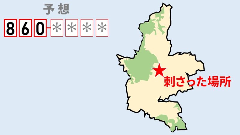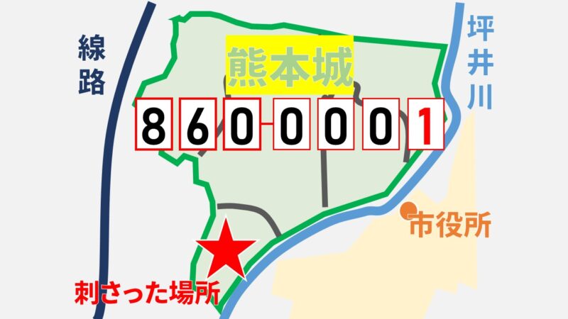 さて、仮にこのナンバリングを採用すると、刺さった場所は「3」、つまり郵便番号は「860-0003」ということになります。