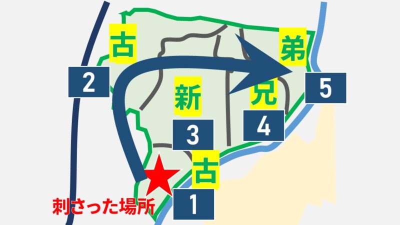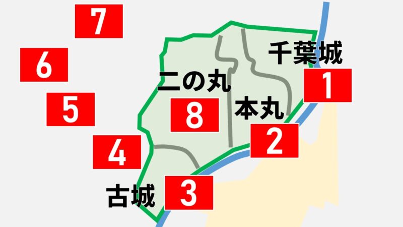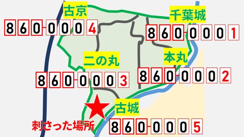 素直に考えれば、東から西へ千葉城(1)→本丸(2)→二の丸(3)→古京(4)とまっすぐ流れていき、流れから若干下に逸れている古城が「5」になりそうな気がする。郵便番号ってこういう「流れ」に乗っかりやすい傾向があるっぽいので。