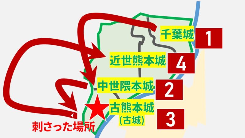 こんな感じで、熊本城は何度か移転・新築されていることがわかりました(古京町はお城ゾーンではなかったみたいなので、勇気の除外)。