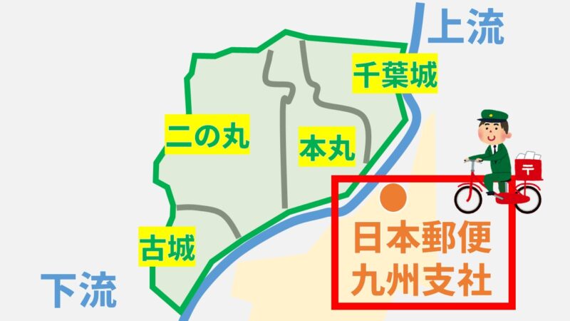 隣を流れる川(熊本城の堀)は東から西に流れていて、また東側に日本郵便のビルがありました。