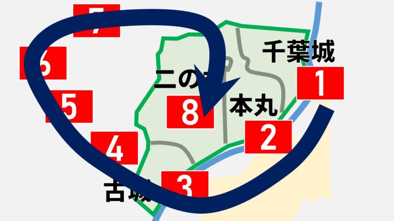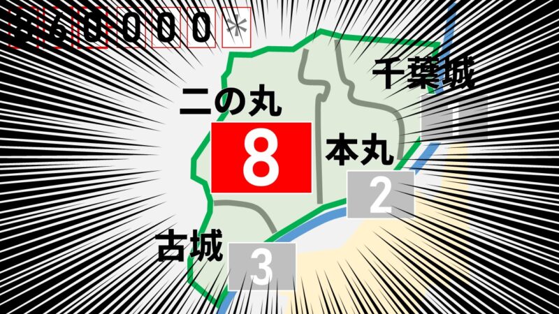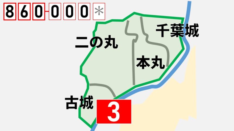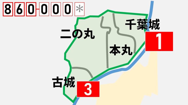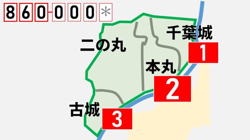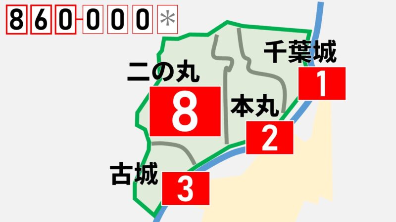 ということで、熊本城エリアの「郵便番号の流れ」は、千葉城(1)→本丸(2)→二の丸(3)→古城(4)の順となります。