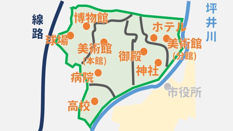 そこで街並みを地図で見てみると、千葉城・本丸・二の丸といった地名ごとに、それぞれ大きめの施設が点在しているようです(美術館、博物館、ホテル、城跡、学校、医療機関、寺社などなど)。