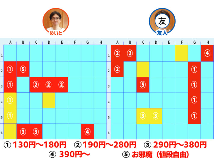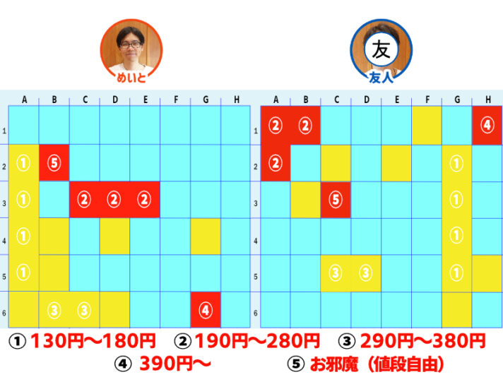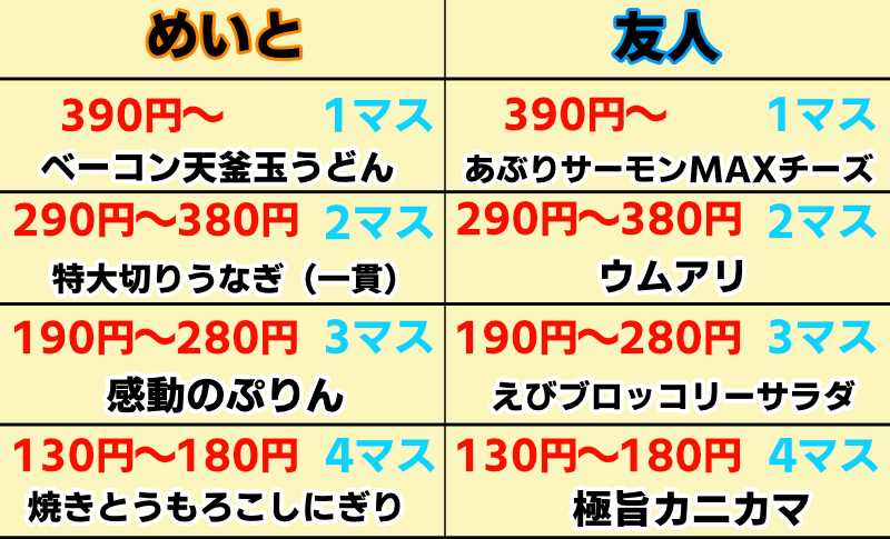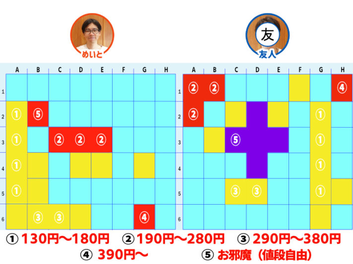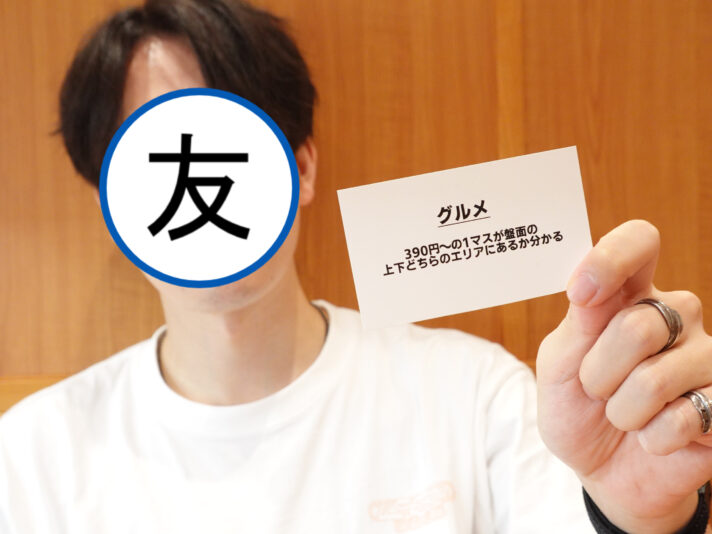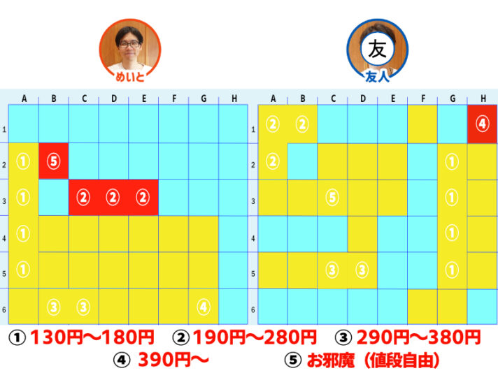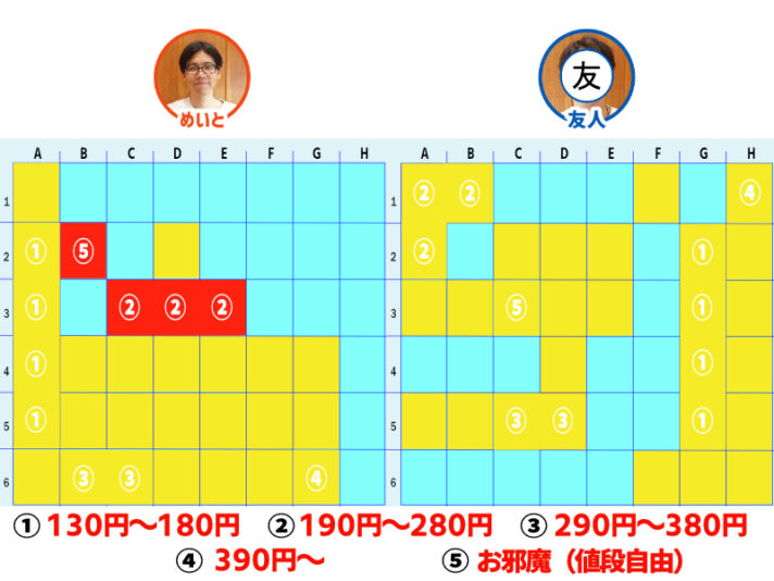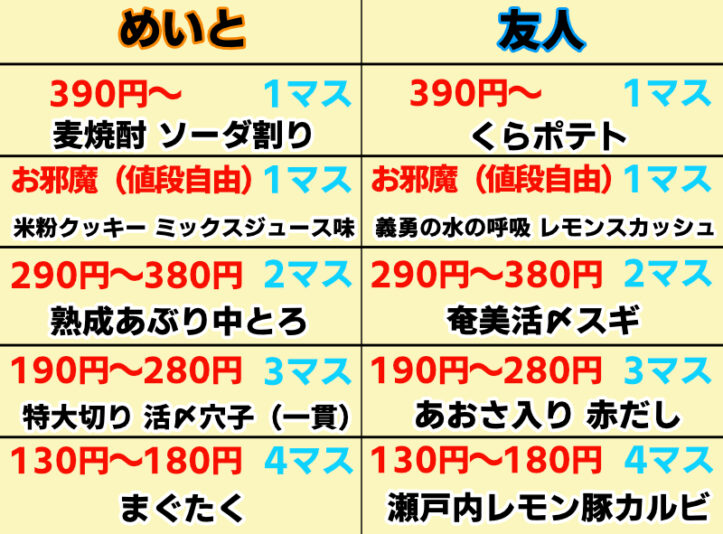 お互いに「②190円~280円」マスを当てる形に。どちらもニヤニヤしながら注文をするので怖いけど、人の飯を決めるって楽しいかも。