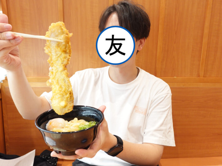 この『ベーコン天釜玉うどん』です。座ってるとずっと視界に入ってくるから気にならない筈がないと思って。