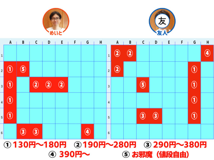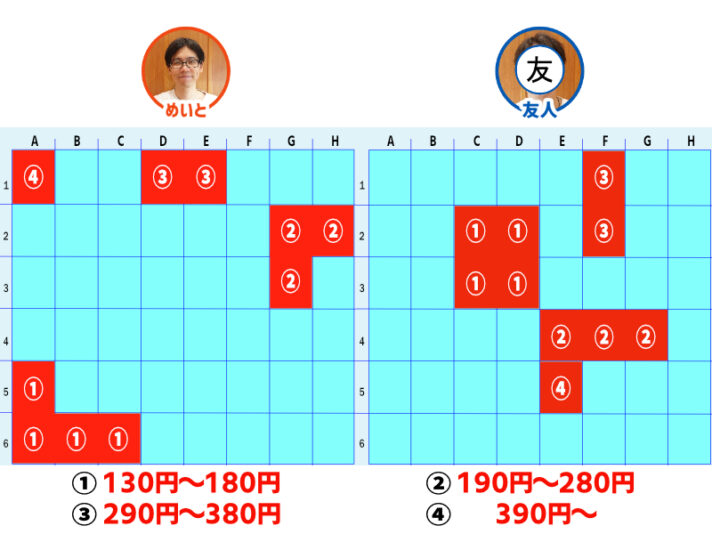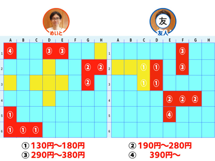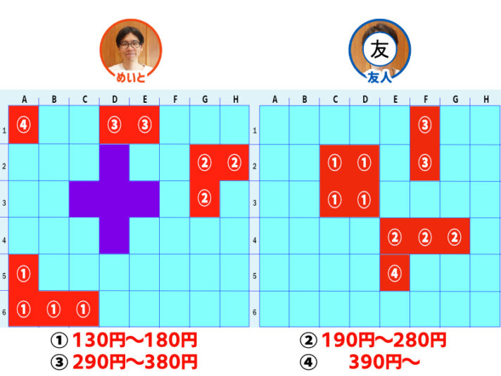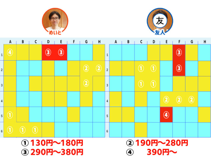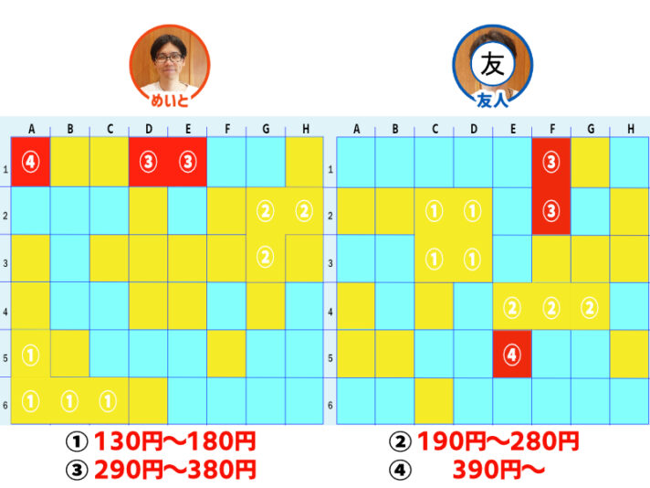 めいとが「① 130円~180円」マスを当てられ、勝負も後半戦。お互いに「③ 290円~380円」と「④ 390円~」のマスを残すのみに。