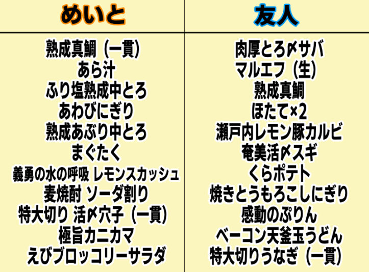 お互いに食べたメニューはこちらになりました。意外と充実している。新しいメニューも知れて満足。