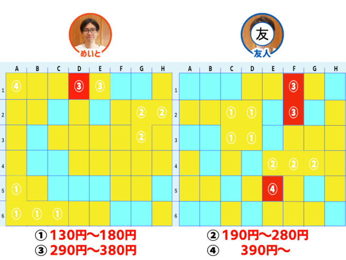 「① 130円~180円」マスを撃ち抜かれるも、運良くめいとが「③290円~380円」マスを直撃!